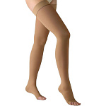 Лечебные удлинённые бедренные чулки с эластичной резинкой, обладающие классом компрессии 1. Выполнены из сочетания полиамида и эластана, что обеспечивает надежную поддержку, вентиляцию кожи и комфорт. Применяются для профилактики и лечения ранних стадий венозной недостаточности, варикоза и отеков нижних конечностей. Конструкция включает градуированное давление, максимальное у лодыжки, с постепенным ослаблением кверху, а верхняя резинка фиксирует чулок на бедре.