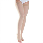 Медицинские компрессионные чулки до паха с компрессией 25 мм рт. ст. и открытым мыском, изготовлены из современных синтетических волокон с добавлением полиамида и эластана, что обеспечивает оптимальную эластичность, прочность и вентиляцию кожи. Рекомендуются для лечения и профилактики хронической венозной недостаточности, варикозного расширения вен и отеков нижних конечностей. Зона применения — от стопы до паха. Конструкция с анатомической формой предусматривает градуированное давление, максимальное в области лодыжки для эффективного венозного оттока и снижение риска тромбообразования. Открытый мыс облегчает контроль состояния стопы. Необходим врачебный контроль при длительном использовании.