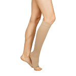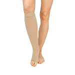 Компрессионный чулок 2 класса компрессии (23-32 мм рт. ст.) с открытым мысом от производителя Смоленск, выполнен из высококачественного эластичного материала с добавлением микрофибры и полиамида. Предназначен для терапии хронической венозной недостаточности, варикоза средней степени, профилактики тромбофлебита и послеоперационной поддержки. Зона применения — голень, давление располагается градуированно, максимальное у щиколотки, уменьшаясь кверху. Отличается прочными плетеными вставками и усиленной резинкой верхней манжеты для фиксирования на бедре.