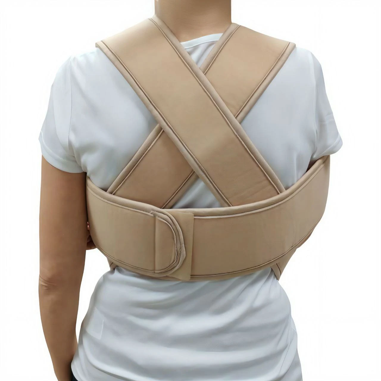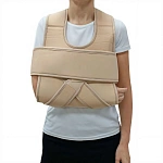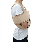 Ортопедическая повязка с регулируемыми лентами и жесткими элементами для иммобилизации плечевого сустава и лопатки. Материалы — воздухопроницаемый, эластичный текстиль с мягкими вставками. Назначение — фиксирование при вывихах, растяжениях, послеоперационных и травматологических состояниях. Позволяет сохранить физиологичное положение руки, снижает нагрузку, облегчает боль.