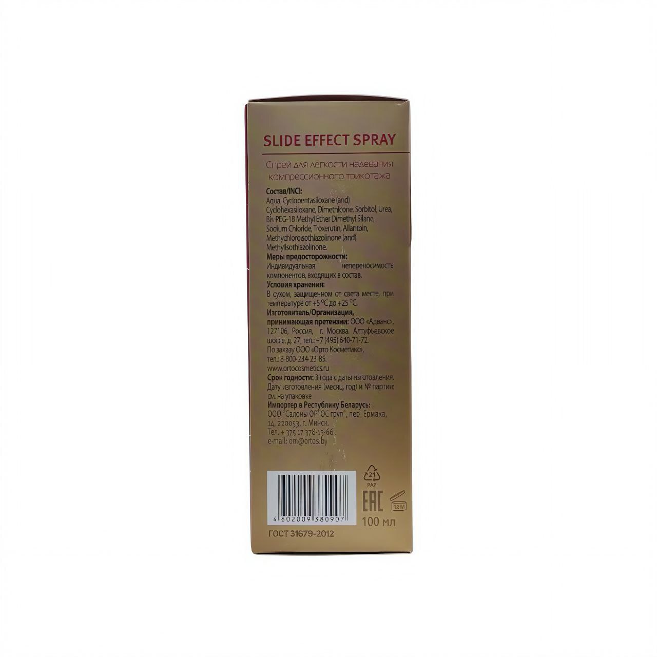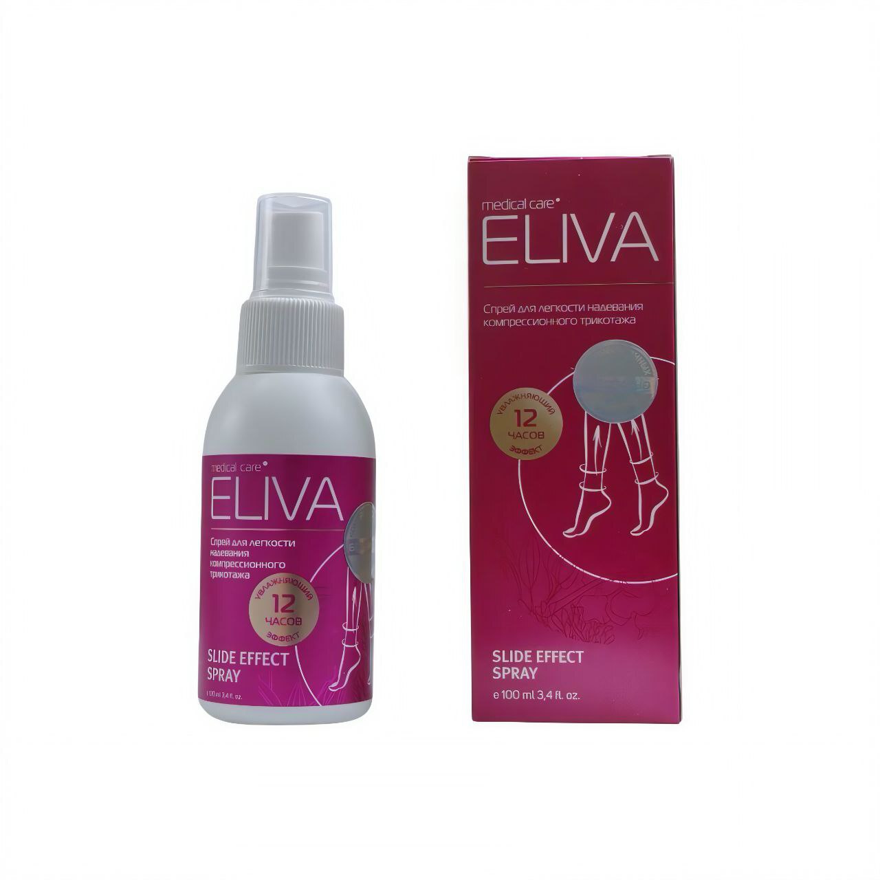 Спрей ELIVA предназначен для облегчения процесса надевания компрессионного трикотажа. Содержит в составе мягкие смягчающие и увлажняющие компоненты, которые уменьшают трение кожи и ткани, предотвращая повреждения и раздражения. Материал — жидкая формула в аэрозольном распылителе объемом около 100 мл. Медицинское назначение — применяется для комфортного использования компрессионных изделий у пациентов с варикозной болезнью и лимфостазом. Зона применения — кожа нижних конечностей. Конструктивно поставляется в легкой упаковке с распылителем для равномерного нанесения.
